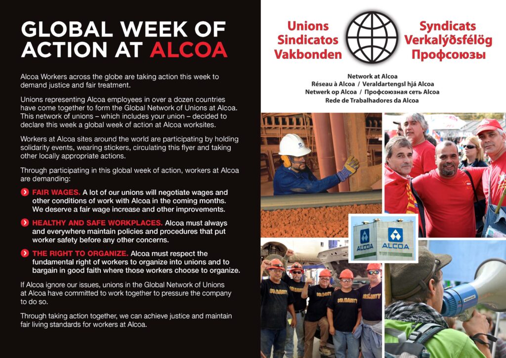 During the global week of action, workers and their unions at Alcoa production sites around the world are participating in numerous ways. These include wearing stickers, holding demonstrations, running ads in newspapers and other activities. A leaflet has been produced in twelve languages for use around the world.