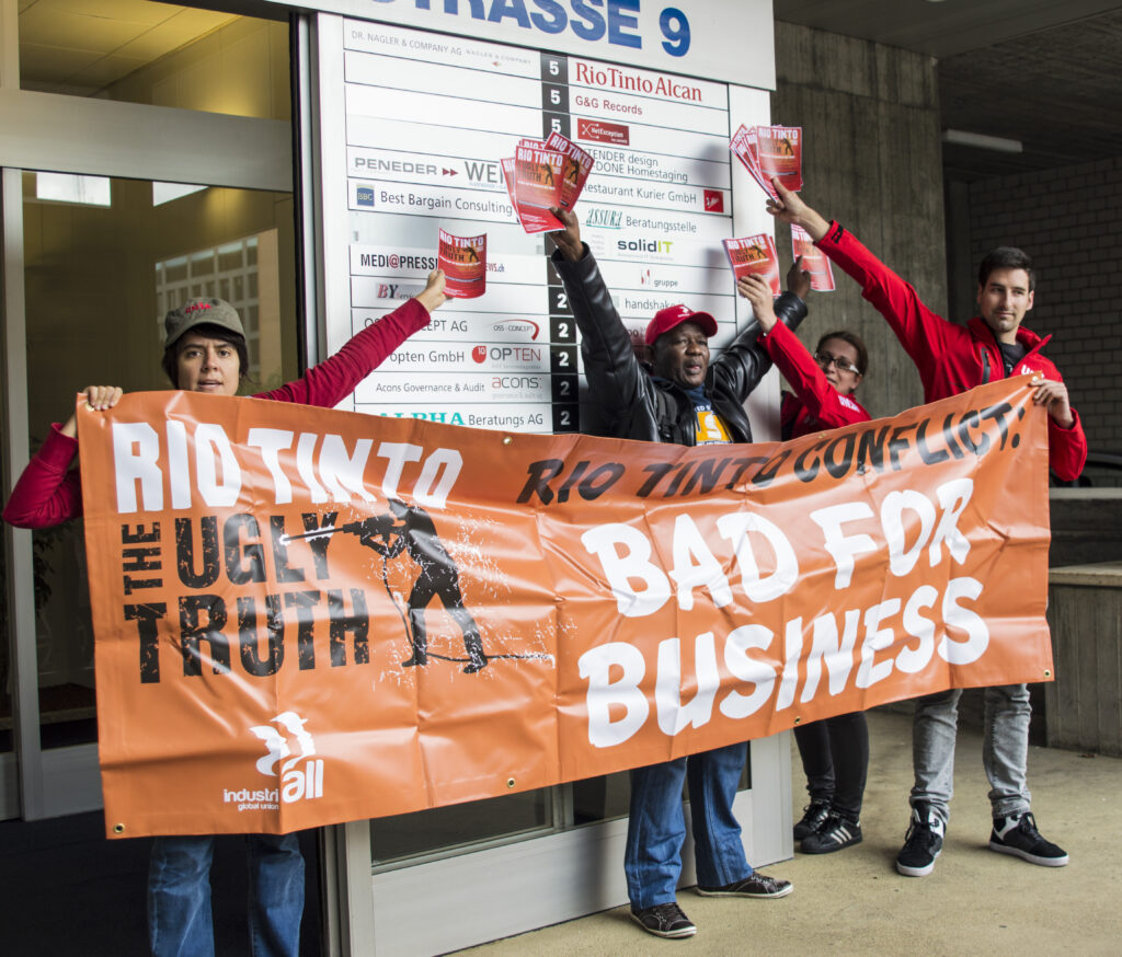 7 octobre, 2014Alors que des actions coordonnées ont lieu le 7 octobre dans le monde, une délégation de IndustriALL et de l’affilié suisse UNIA s’est rendue à Zurich avec le message de milliers de salariés de Rio Tinto dans le monde pour mettre fin aux infractions aux droits travailleurs et travailleuses et pour ‘nettoyer à fond Rio Tinto’.