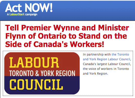 Send your letter to Ontario Premier Kathleen Wynne and Labour Minister Kevin Flynn asking them to take further action on the side of workers and stop a new era of union busting in Canada. The online action is available on LabourStart