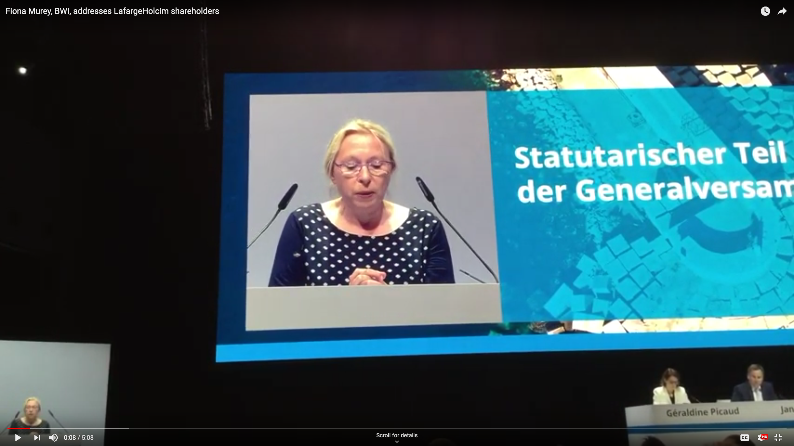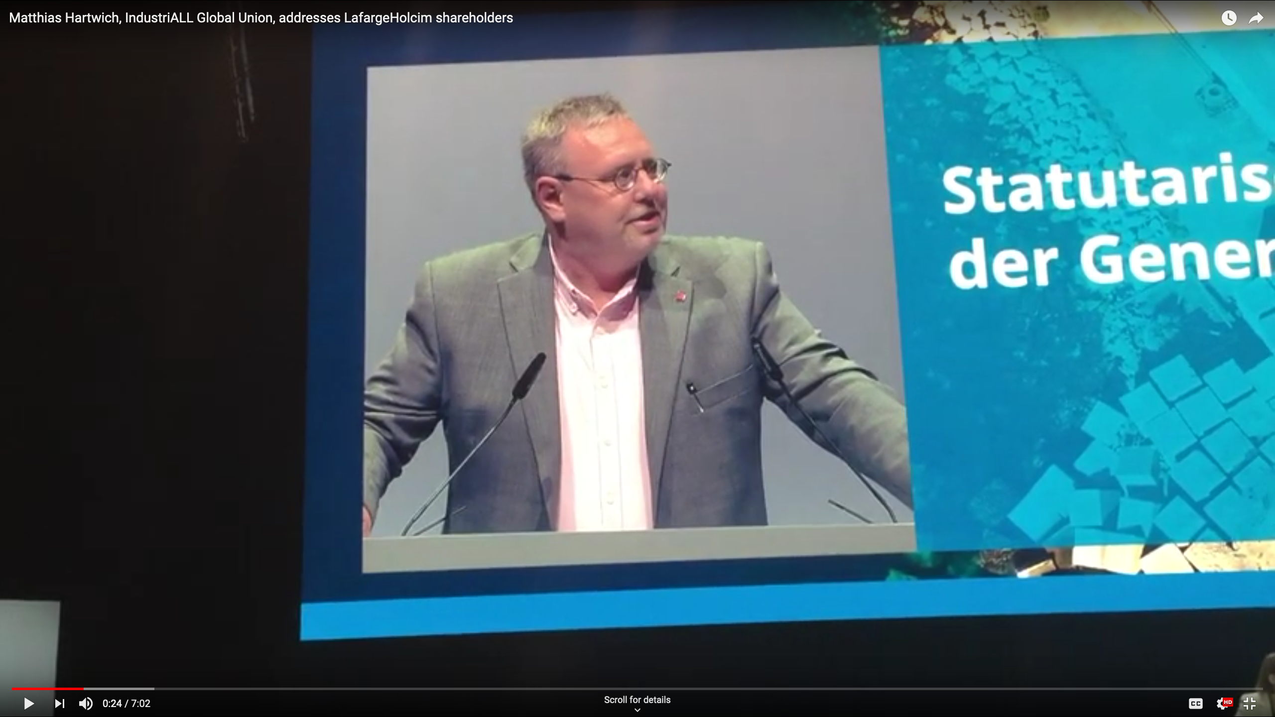 16 May, 2019IndustriALL Global Union, Building and Wood Workers International (BWI) and the Belgian trade union Centrale Générale / Fédération Générale des Travailleurs de Belgique (CG-FGTB) informed shareholders of the cement multinational LafargeHolcim at their annual general meeting held on 15 May 2019 in Switzerland about the misbehaviour of the company and demanded respect for the workers worldwide.