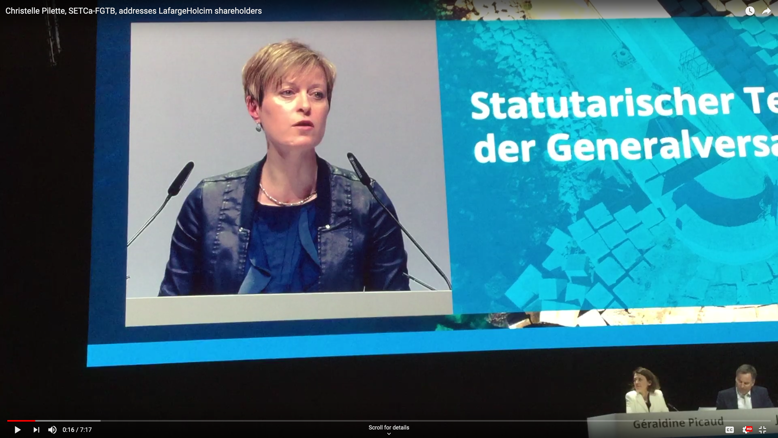 Christelle Pilette, Belgian representative in the European Works Council (EWC) and member of the Belgian union Centrale Générale / Fédération Générale des Travailleurs de Belgique (CG-FGTB) demanded that the company respect European directives on information and consultation with the EWC and employees before making decisions which have consequences for men and women working for LafargeHolcim. She insisted that LafargeHolcim must take energetic steps towards gender equality and against harassment at work. She also demanded respect for European legislation and directives in favour of employees.