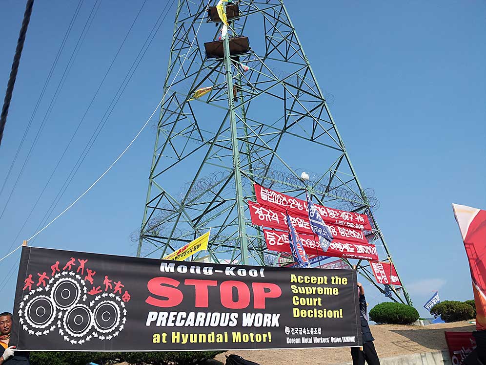 The precarious workers have been carrying out strikes at Hyundai Motor in Korea and protest actions, symbolized by the aerial protest on top of a pylon in front of Hyundai Motor plant in Ulsan demanding implementation of the court decision: http://www.industriall-union.org/korean-workers-stage-protest-against-hyundai