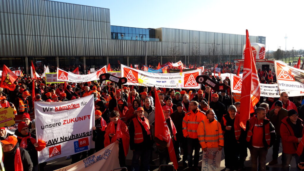 On 4 December 2,500 workers of thyssenkrupp Elevator rallied in Essen, Germany, at the group headquarters, demanding a clear strategy and job guarantees. Just one day before, on 3 December, about 6,000 steelworkers staged their rally in Duisburg, also Germany. They succeeded in concluding a no-redundancy agreement for the steel business, and that is exactly what also the Elevator workers demand. Protests also took place in other locations and sites, including in Spain, where over 6,000 workers are affected at thyssenkrupp Elevator unit.