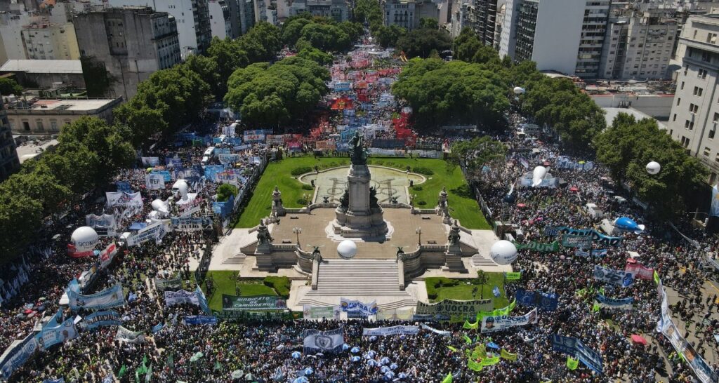 Trade unions, including union federations CTA-A, CGT, CTA-T and UTEP, along with other civil society organizations, came together for the first general strike in Argentina since 2019. According to Argentina’s union federations, more than 700,000 people marched on the National Congress in Buenos Aires and 1.5 million took part in campaigns held across the country in support of people’s rights, the separation of powers, democracy and the constitution.