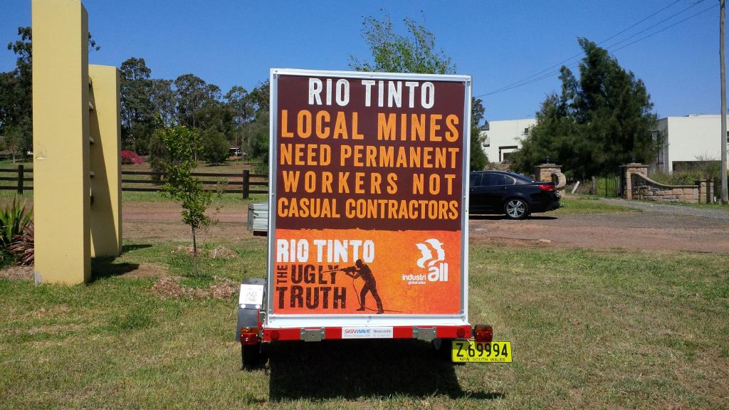 CFMEU in the north near mine sites drove a trailer pulling a sign with the Rio Tinto The Ugly Truth logo and a variety of messages about the need for less precarious labor at Rio Tinto. It was part of the effort to build awareness among union members and communities about the global campaign at Rio Tinto and Rio Tinto’s bad employment practices.