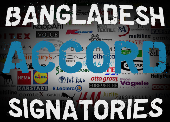 Bangladesh signatory listAdd to favouritesRead this article in:English2 September, 2013The full list of company signatories to the accord1LOBLAWSCANADA2ABERCROMBIE & FITCHUSA3AMERICAN EAGLE OUTFITTERS, INCUSA4KNIGHTS APPARELUSA5PVHUSA6SCOOP NYCUSA7SEAN JOHN APPARELUSA8TOP OF THE WORLDUSA9ADIDASGERMANY10ALDI NORDGERMANY11ALDI SOUTHGERMANY12 BELOTEXGERMANY13 BRANDS-FASHIONGERMANY14C&AGERMANY & BELGIUM15 CHICCAGERMANY16 COLOMBUS TEXTILVERTRIEBGERMANY17COMTEXGERMANY18 DAYTEXGERMANY19 DELTEXGERMANY20 DISTRAGERMANY21ERNSTING'S FAMILYGERMANY22 FLORETT TEXTILGERMANY23 FULL SERVICE HANDELSGERMANY24 GEBRAGERMANY25 G.GUELDENFENNIGGERMANY26 HERDING HEIMTEXTILGERMANY27HESS NATUR-TEXTILENGERMANY28 HORIZONTEGERMANY29HÜREN OHGGERMANY30 JOLO FASHIONGERMANY31JURITEXGERMANY32KARL RIEKERGERMANY33KARSTADTGERMANY34KIKGERMANY35LIDLGERMANY36 METROGERMANY37MULTILINEGERMANY38 NEW FRONTIERGERMANY39OLYMPGERMANY40OSPIGGERMANY41OTTO GROUPGERMANY42PUMAGERMANY43REWEGERMANY44S OLIVERGERMANY45 SCHMIDT GROUPGERMANY46STEILMANN HOLDING GROUPGERMANY47TCHIBOGERMANY48UNCLE SAMGERMANY49 VIANIAGERMANY50 WUNSCHE GROUPGERMANY51ARCADIAUK52BONMARCHEUK53DEBENHAMSUK54EDINBURGH WOOLEN MILLUK55FAT FACEUK56JOHN LEWISUK57OTLBRANDSUK58MARKS & SPENCERUK59MATALANUK60MOTHERCAREUK61N BROWNUK62NEW LOOKUK63NEXTUK64PRIMARKUK65RIVER ISLANDUK66SAINSBURY'SUK67SHOP DIRECT GROUPUK68TESCOUK69AUCHANFRANCE70CAMAIEUFRANCE71CARREFOURFRANCE72 GROUPE CASINOFRANCE73LECLERCFRANCE74DE BIJENKORFNETHERLANDS75 FASHIONLINQNETHERLANDS76HEMANETHERLANDS77 O'NEIL EUROPE BVNETHERLANDS78 TEXSPORT BVNETHERLANDS79V&DNETHERLANDS80WE EUROPENETHERLANDS81ZEEMANNETHERLANDS82GSTARNETHERLANDS83JBCNETHERLANDS84AHLENSSWEDEN85 GINA TRICOTSWEDEN86ICASWEDEN87KAPPAHLSWEDEN88H&MSWEDEN89HEMTEX ABSWEDEN90BESTSELLERDENMARK91COOP DANMARKDENMARK92DANSKDENMARK93DK COMPANYDENMARK94 IC COMPANYS A/SDENMARK95TEXMANDENMARK96HELLY HANSENNORWAY97VARNER GROUPNORWAY98VOICE NORGE ASNORWAY99STOCKMANNFINLAND100COTTON ONAUSTRALIA101FOREVER NEWAUSTRALIA102KMARTAUSTRALIA103 SPECIALITY FASHIONSAUSTRALIA104TARGETAUSTRALIA105 WOOLWORTHSAUSTRALIA106BENETTONITALY107ESPRITHONG KONG & GERMANY108 TOPGRADE INTERNATIONALHONG KONG109CHARLES VOEGELESWITZERLAND110SWITCHERSWITZERLAND111VISTAPRINTSWITZERLAND112EL CORTE INGLESSPAIN113INDITEXSPAIN114MANGOSPAIN115 JOGILOBELGIUM116VAN DER ERVEBELGIUM117 FAST RETAILINGJAPAN118LC WAIKIKITURKEY119LPPPolandBangladeshAction on BangladeshRelated linksSee full information on the accord here