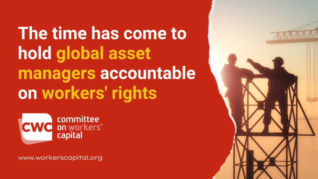 Global asset managers invest capital on behalf of workers’ retirement savings funds. Pension fund trustees who sit on the boards of these funds and participate in the CWC network expect that their managers will uphold their responsibilities to mitigate adverse labour rights impacts in their investments, and positively address labour grievances when raised. Likewise, other types of asset owner vehicles, including foundations and religious investors, also have growing expectations of their managers.