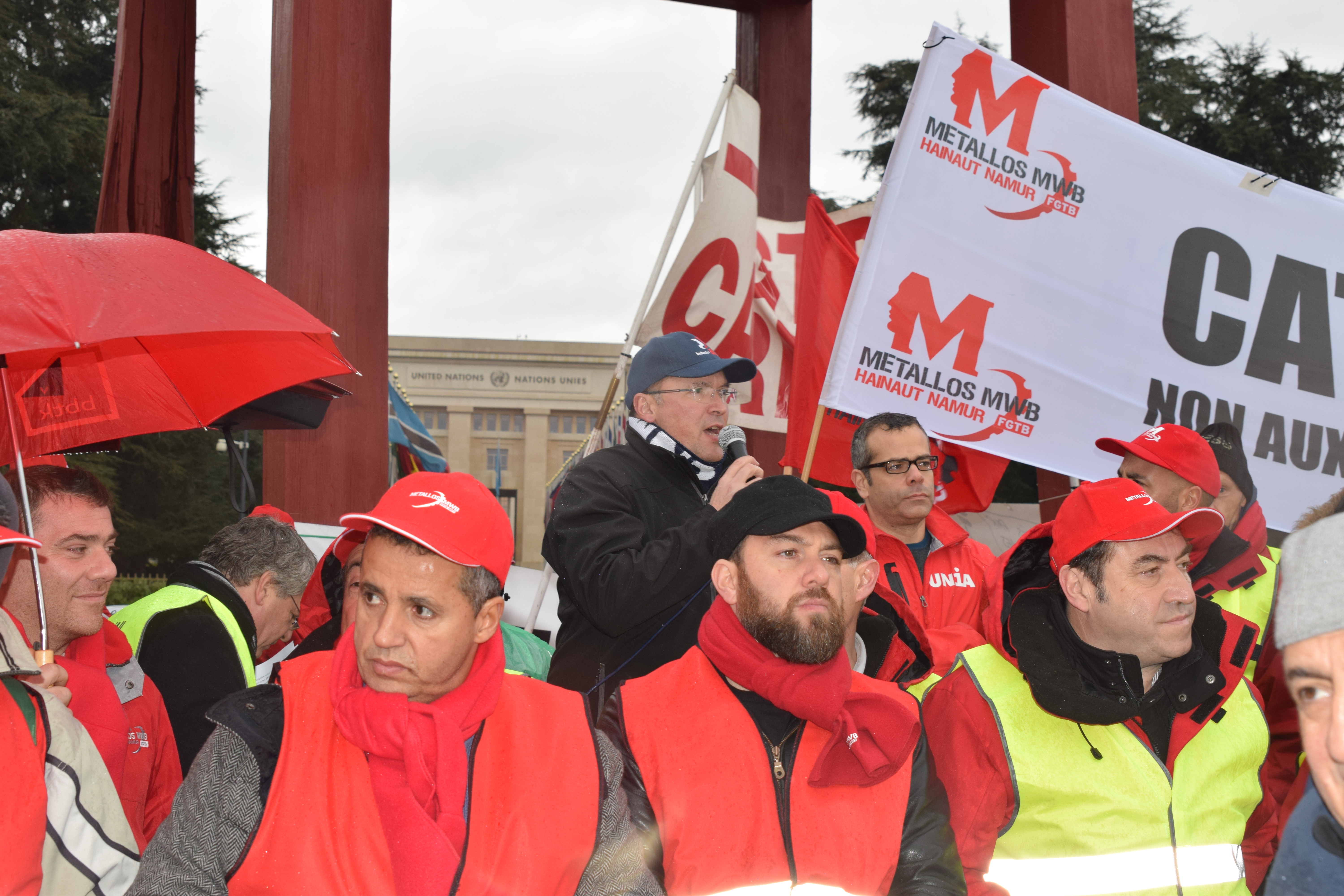 18 November, 2016Representatives of Caterpillar workers from across Europe rallied in Geneva today to protest the company’s plans to shut plants in Belgium and Northern Ireland.