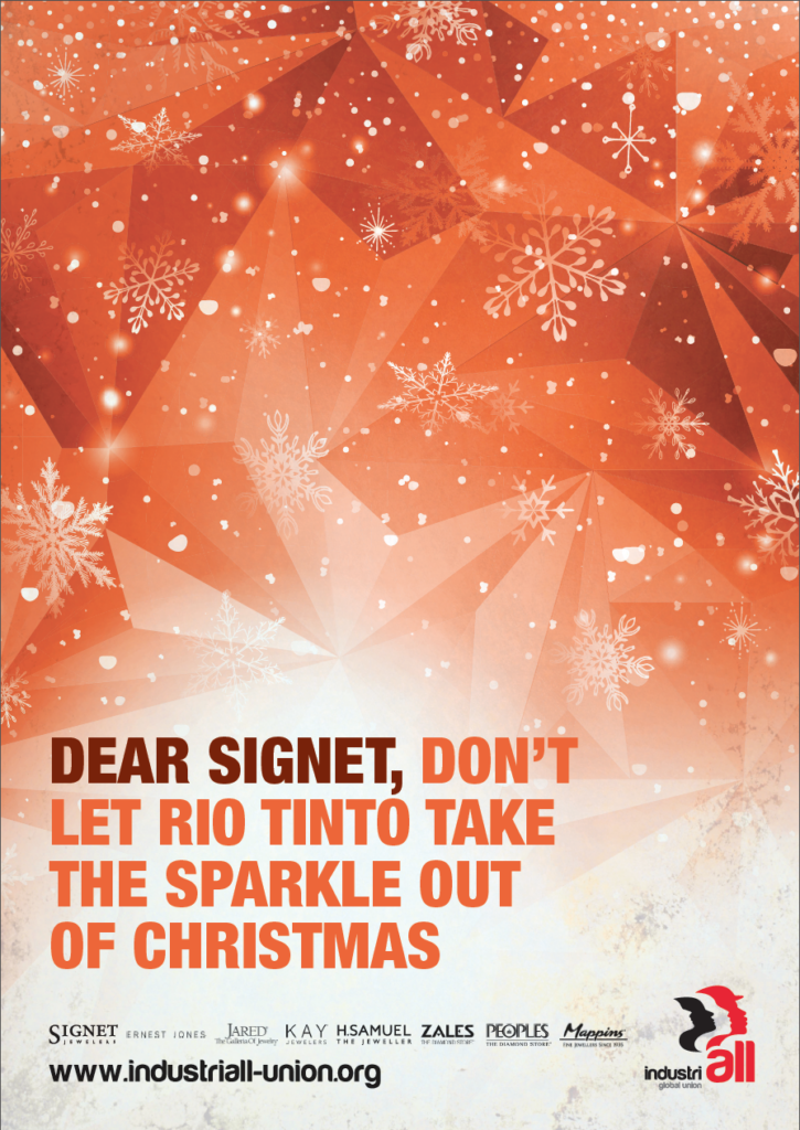 14 December, 2015This holiday season, unions are again calling on one of the world’s largest jewellery retailers to clean up its supplier of diamonds. They are urging Signet to demand that multinational mining and metals giant Rio Tinto respect workers’ rights, indigenous peoples and the environment.