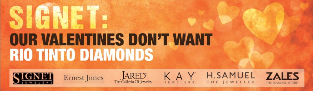 This Valentine’s Day, IndustriALL Global Union, London Mining Network, Earthworks, and LabourStart are challenging the world’s biggest jewellery retailer Signet to demand that its major diamond supplier, multinational mining company Rio Tinto, clean up its mining practices so that they respect worker rights, indigenous peoples and the environment.