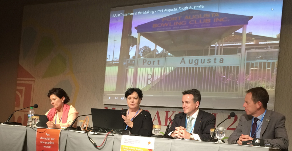 Un evento paralelo interesante coordinado por Sharan Burrow con la participación de representantes del Gobierno australiano y otros se centró en la transición justa en el contexto de Port Augusta (Australia), una comunidad económicamente dependientes de una central térmica de carbón, pero que tiene planes para convertirse en líder en energía solar.