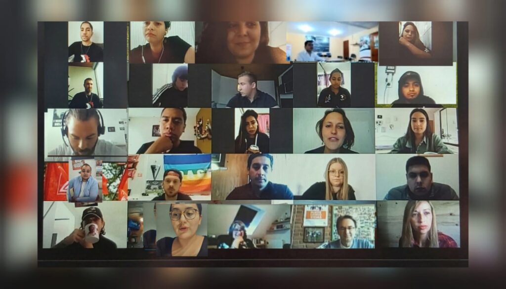 Los 15 participantes de América Latina y 7 de Alemania permanecieron conectados a la videollamada durante 5 horas. También acompañaron el evento invitados y compañeros de las organizaciones auspiciantes. Entre ellos, Sarah Flores, encargada de proyectos para la juventud de IndustriALL; Angélica Jiménez y Horst Mund del departamento de internacionales de IG Metall; y Dominique Klawonn de la FES.