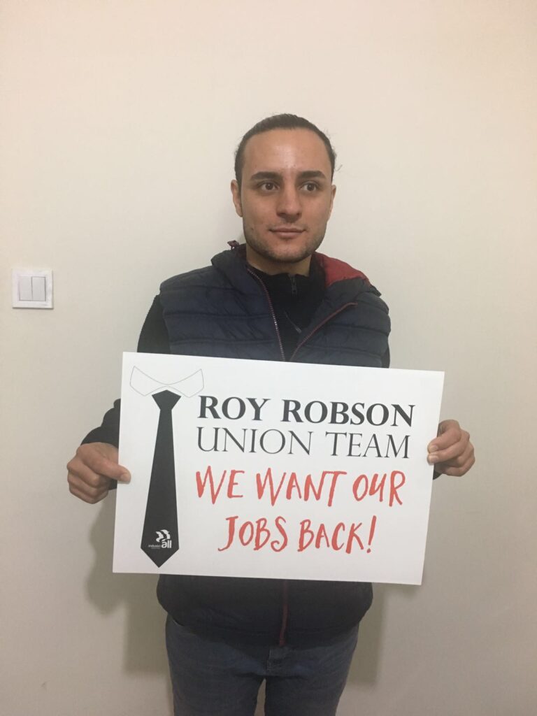 “Roy Robson ha marcado un gol en propia puerta despidiendo a su mejor equipo. Los once sindicalistas se han comprometido a conseguir mejores condiciones en la empresa. Roy Robson tiene que respetar los derechos de los trabajadores a organizarse.”