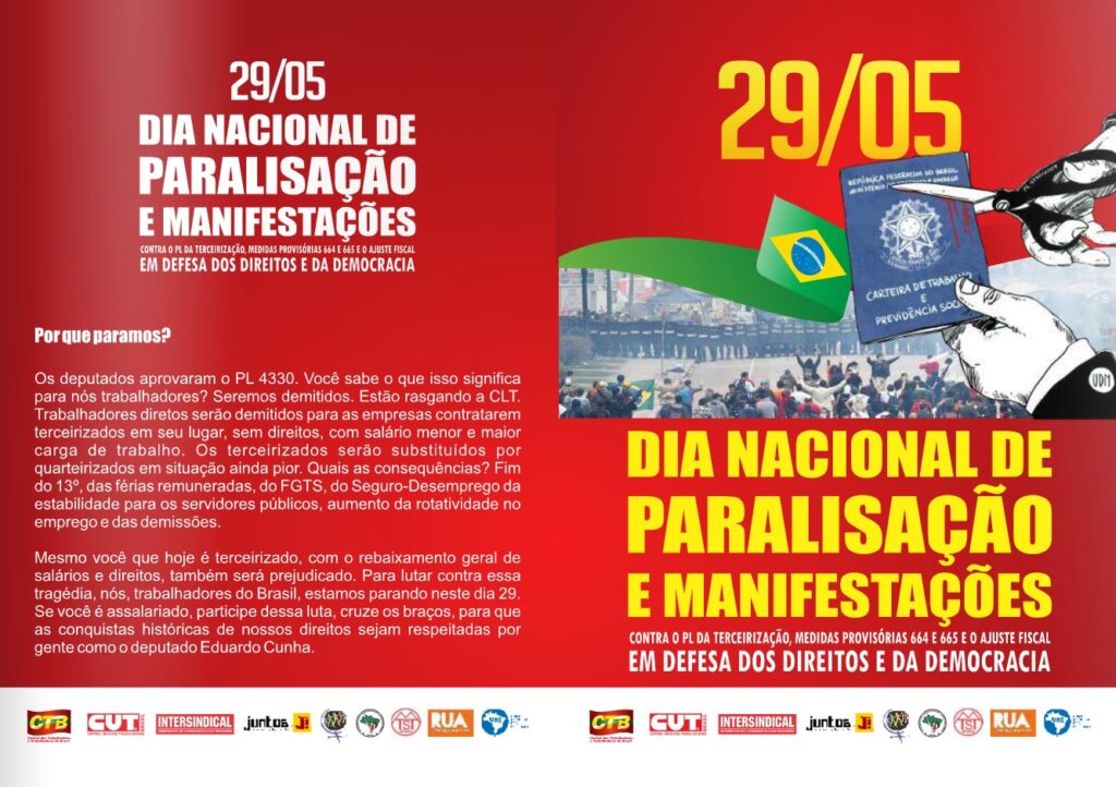 Frente a la decisión del Senado, el viernes 29 de mayo importantes centrales y sindicatos convocaran un Día Nacional de Paralización y Manifestaciones de la organización sindical y los movimientos para pronunciarse por un lado en contra de la MP 664 y 665, que trata de los ajustes fiscales. Por otro lado se posicionaron en contra el Proyecto de ley PL 4330 de la tercerización, propuesto y ya aprobado por el congreso nacional desde el presidente de la Cámara Eduardo Cunha PMDB. Este segundo proyecto de ley legaliza la tercerización y aumenta el trabajo precario.