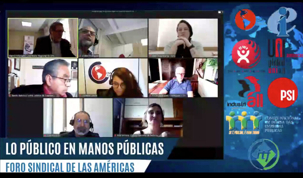 En el marco de la Jornada mundial por trabajo decente, la Confederación sindical de trabajadoras y trabajadores de las Américas (CSA), ISP, UNI, IndustriALL Global Union, ITF, ICM, IE y el Comité brasileiro en defensa de las empresas públicas desarrollaron un foro regional con modalidad online para lanzar una campaña unificada, el 7 de octubre.
