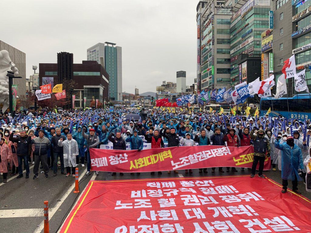 Hoy, 21 de noviembre de 2018, 128.277 trabajadores en 109 lugares de trabajo del KMWU se unieron a una huelga por no tratar el Gobierno de impedir el dominio de los conglomerados industriales conocidos como chaebols, y por la reforma de la legislación laboral para garantizar los derechos fundamentales de los sindicatos.