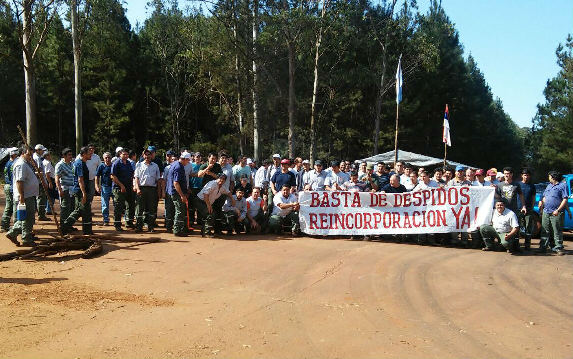 El Sindicato de Obreros y Empleados Papeleros (SOEP) de Misiones actualmente reclama que reintegren a los 20 trabajadores despedidos de la empresa de celulosa Arauco. El SOEP está adherido a la Federación de Trabajadores de la Energía, Industria, Servicios y Afines (FeTIA), quien a su vez es afiliada a IndustriALL Global Union. También piden mejores condiciones de trabajo porque aseguran que existe insalubridad laboral.