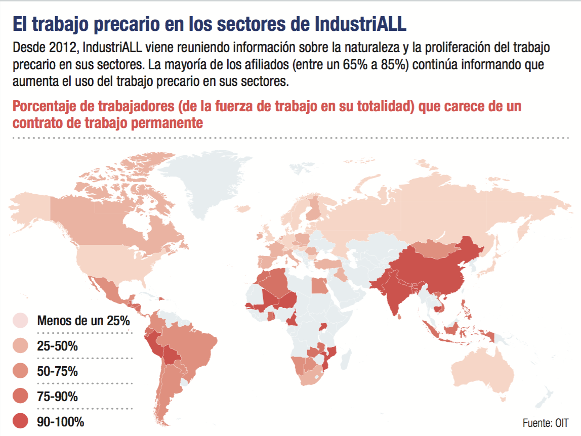 En las últimas décadas se ha visto un aumento generalizado del trabajo precario en todo el mundo. Aunque un 70% de la población activa de Europa y Estados Unidos aún cuenta con puestos de trabajo permanentes y directos, las formas precarias de empleo están aumentando. En los países de bajos ingresos, las formas predominantes de empleo son el trabajo por cuenta propia, a contrata e informal.