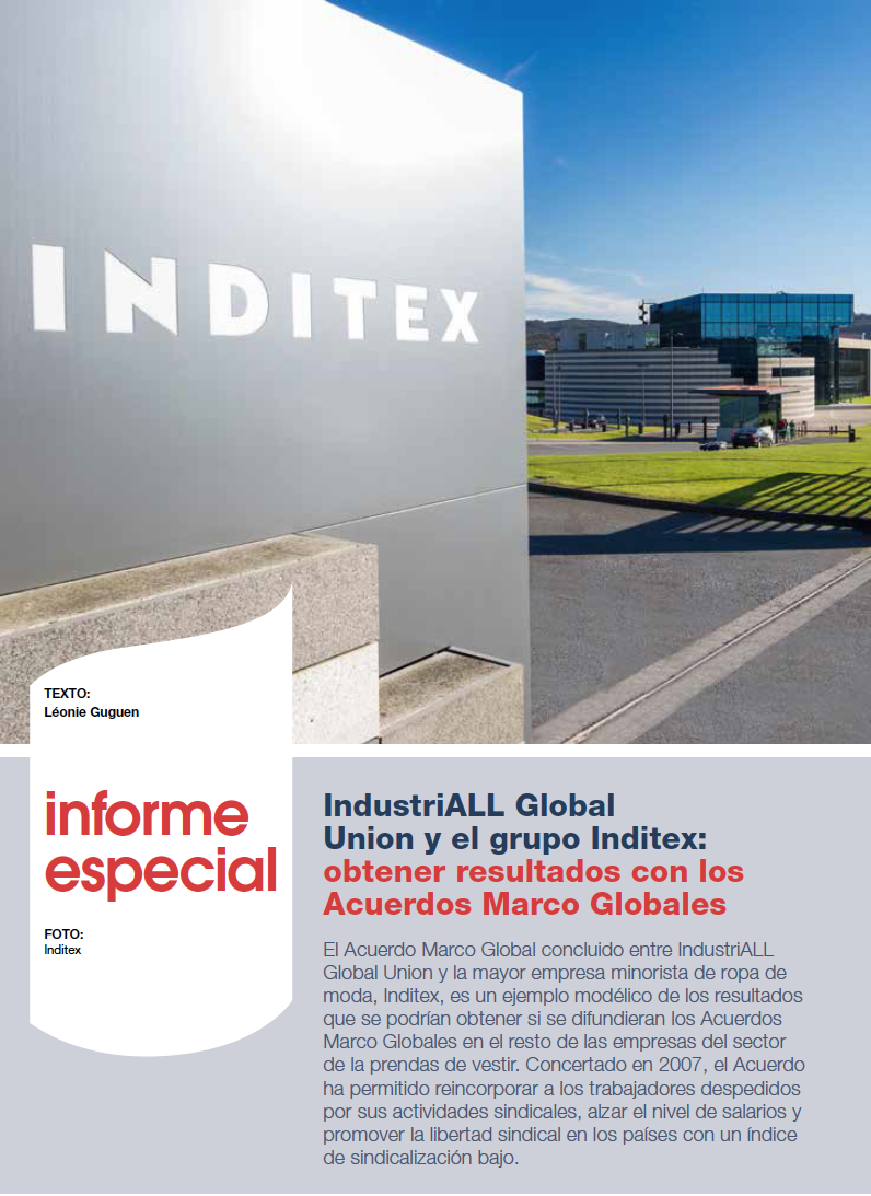 21 mayo, 2014El Acuerdo Marco Global concluido entre IndustriALL Global Union y la mayor empresa minorista de ropa de moda, Inditex, es un ejemplo modélico de los resultados que se podrían obtener si se difundieran los Acuerdos Marco Globales en el resto de las empresas del sector de la prendas de vestir. Concertado en 2007, el Acuerdo ha permitido reincorporar a los trabajadores despedidos por sus actividades sindicales, alzar el nivel de salarios y promover la libertad sindical en los países con un índice de sindicalización bajo.