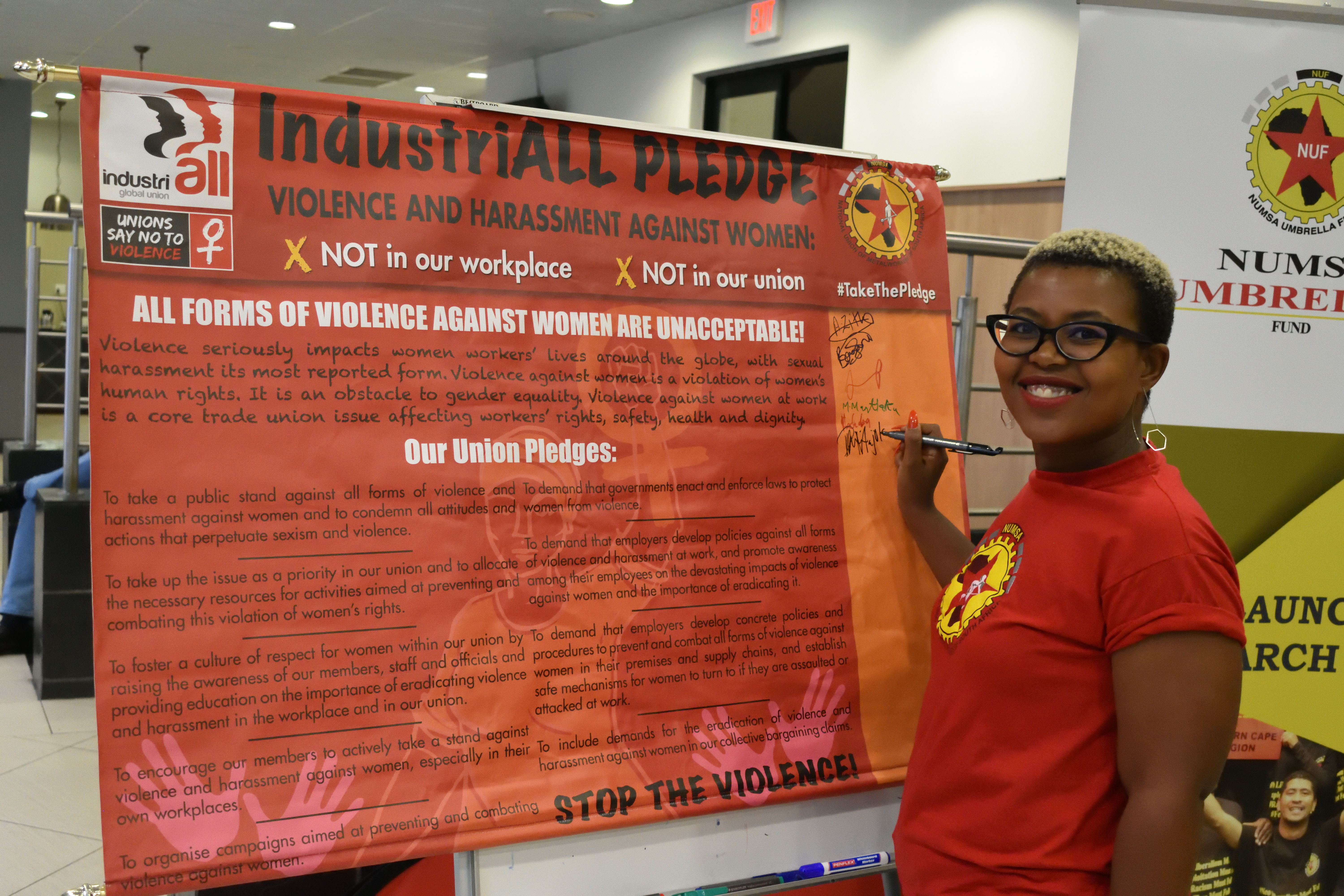 Asumiendo el compromiso de IndustriALL, los afiliados se comprometen a continuar y reforzar sus acciones para detener la violencia contra las mujeres en el lugar de trabajo y en los sindicatos.