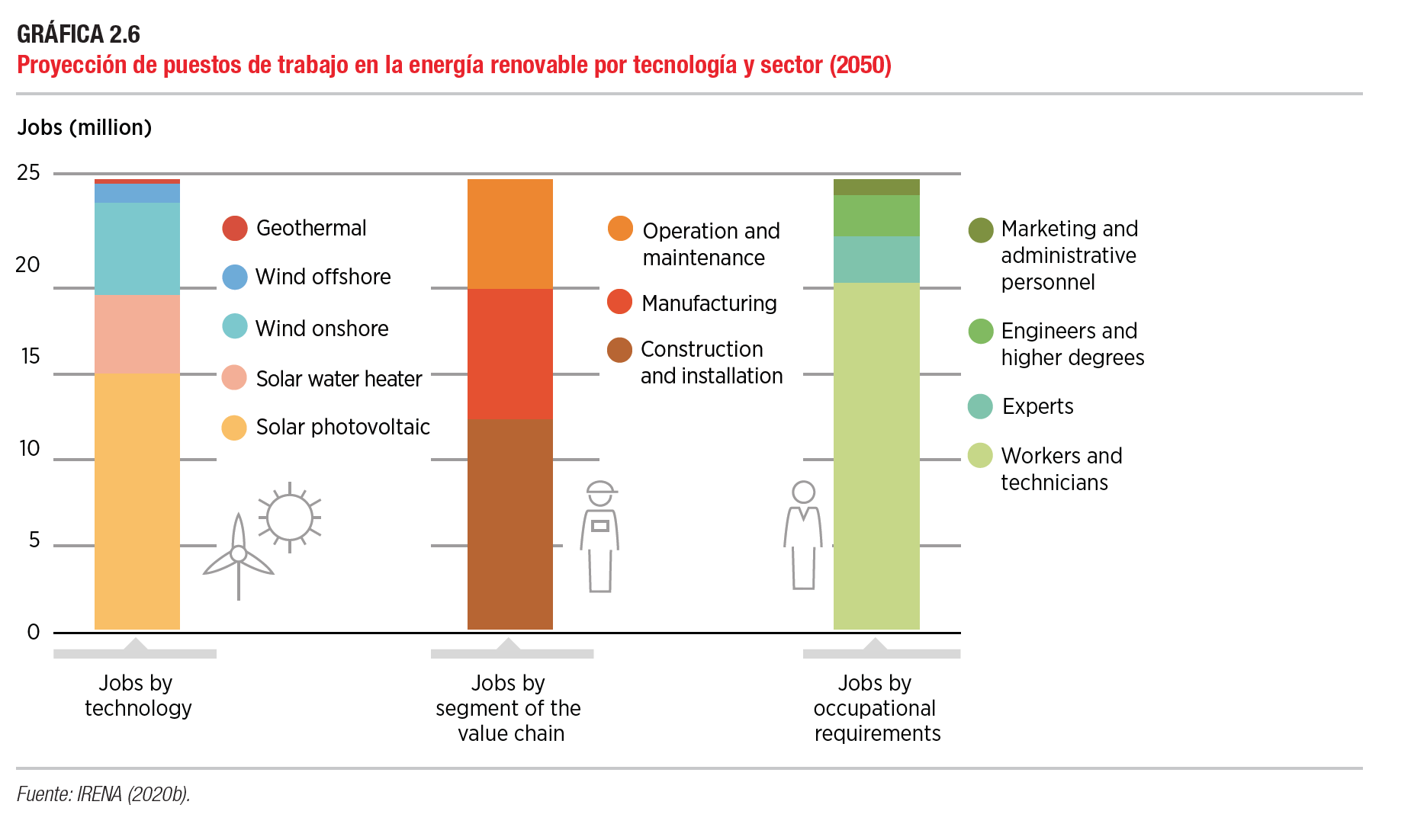 El informe presenta la situación actual y las proyecciones en materia de empleo en el sector renovable, con desgloses por región y por fuente de energía. No existen garantías de empleos de calidad: para 2050, dos tercios de los 25 millones de empleos previstos en energías renovables estarán en la energía solar, mientras que la mayor parte restante pertenecerá al sector de la energía eólica terrestre. No obstante, la mayoría de estos empleos se encontrarán en la fabricación de componentes, así como en la construcción y la instalación. Se espera que se generen unos cinco millones de puestos de trabajo en el área de operación y mantenimiento, la mayoría de ellos empleos manuales.