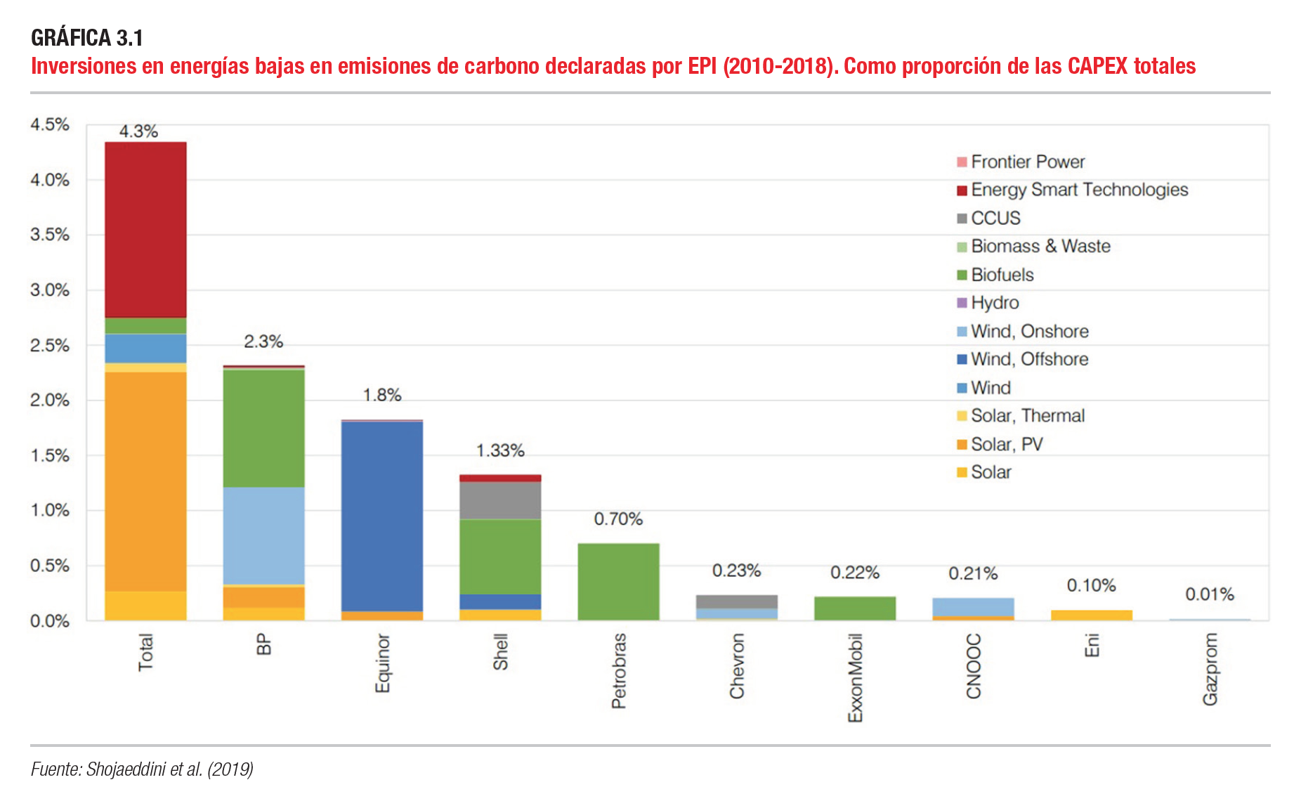 Una tendencia que es inmediatamente evidente es la brecha entre la retórica corporativa sobre ecologizar el futuro y las inversiones. La mayoría de las empresas de energía se han embarcado en importantes campañas de relaciones públicas, a veces renovando su imagen por completo, en las que mencionan la transición energética. No obstante, el informe muestra que incluso Total, la empresa con el porcentaje más alto de inversión, solo ha invertido el 4,5 por ciento de su gasto de capital en energías renovables. La mayoría de las otras empresas han invertido la mitad o menos de esa cantidad.