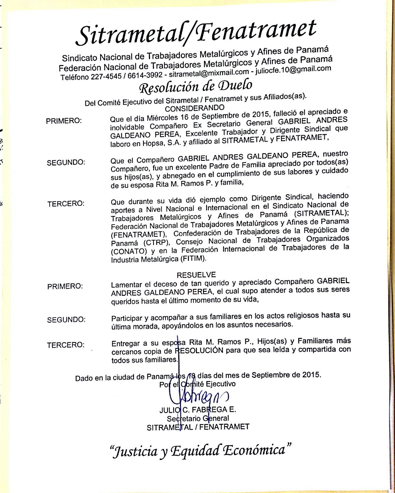 “La muerte de Gabriel Galdeano Perea es una pérdida irreparable para el Movimiento Sindical Panameño en general y para FENATRAMET en particular. Nuestras condolencias para sus familiares y seres queridos”