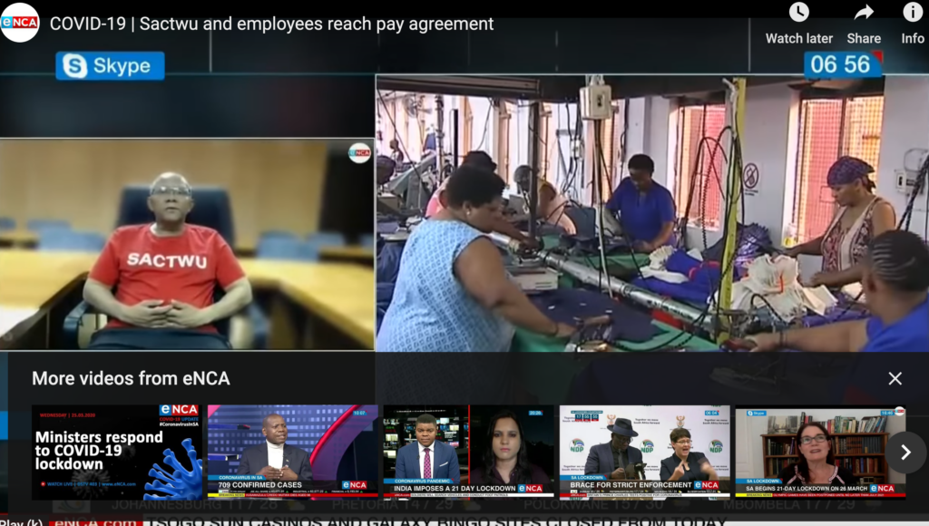 El martes por la tarde, el SACTWU negoció el primer convenio colectivo nacional de Sudáfrica relativo a la cuarentena por el COVID-19 con el Consejo Nacional de Negociación para la Industria de la Confección. Este convenio único asegura que los trabajadores continuarán recibiendo su salario completo durante las próximas seis semanas.