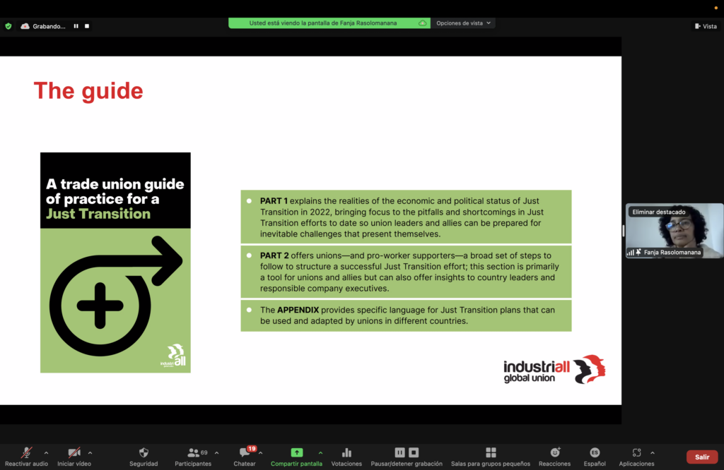 Luego fue el turno de la oficial de programas de IndustriALL, Fanja Rasolomanana de presentar la guía. Explicó que el documento propone un plan de 24 meses para lograr una transición justa. Se trata de una propuesta de 5 pasos divididos en meses para establecer un diálogo social entre las partes implicadas (gobiernos, empresas y sindicatos) e implementar una transición justa en los diversos sectores industriales.