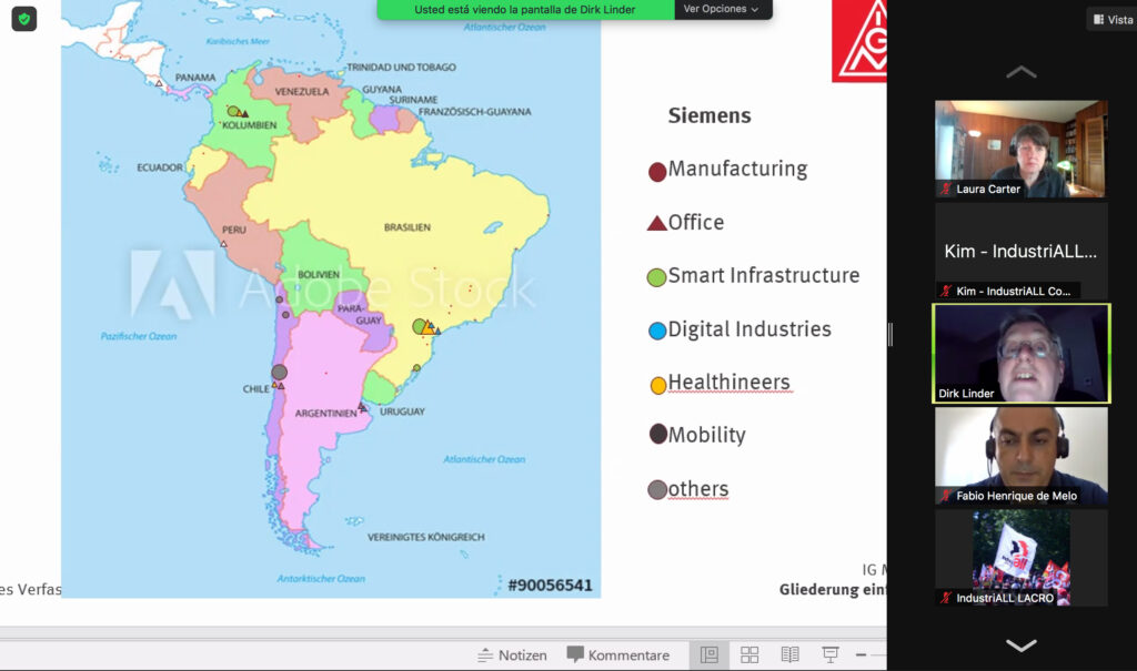 Además, Linder explicó que IG Metall es responsable de monitorear que se cumpla el Acuerdo marco global que renovó IndustriALL Global Union con Siemens en 2019. Aseguró que el objetivo es lograr que en 2022 firmen otro AMG con Siemens energy para lograr trabajar en conjunto y que la empresa respete los derechos sindicales.