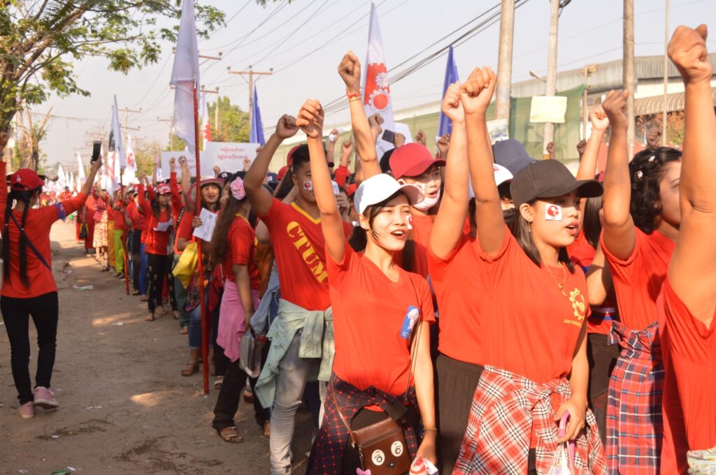 El presidente de la IWFM, Daw Khaing Zar Aung, dirigió a la multitud exclamando las siguientes consignas: