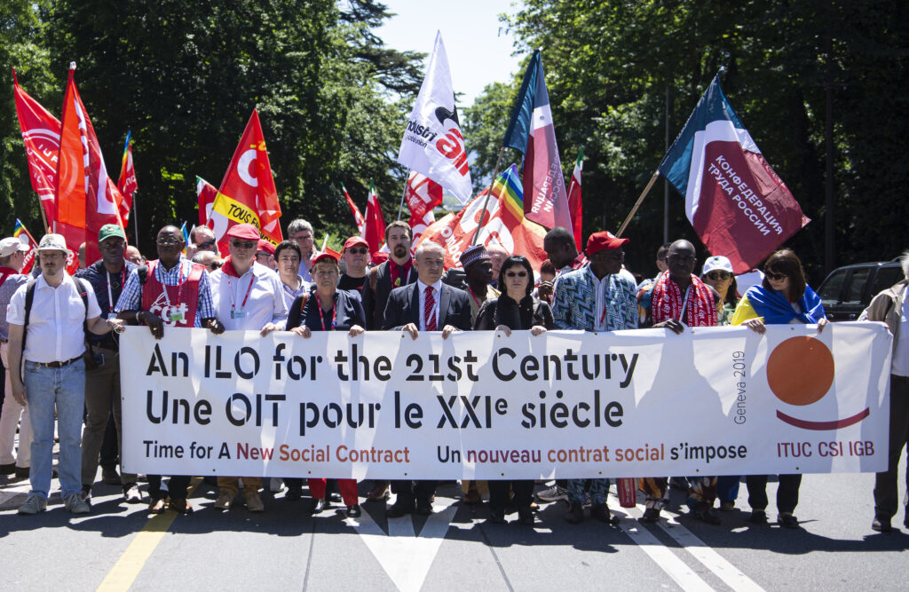 19 junio, 2019En el centenario de la Organización Internacional del Trabajo, los sindicatos de todo el mundo que asisten a la Conferencia Internacional del Trabajo marcharon hasta llegar a la gigantesca Silla Rota que se halla en la plaza frente a las oficinas de la ONU en Ginebra para pedir un contrato social justo para el siglo XXI.
