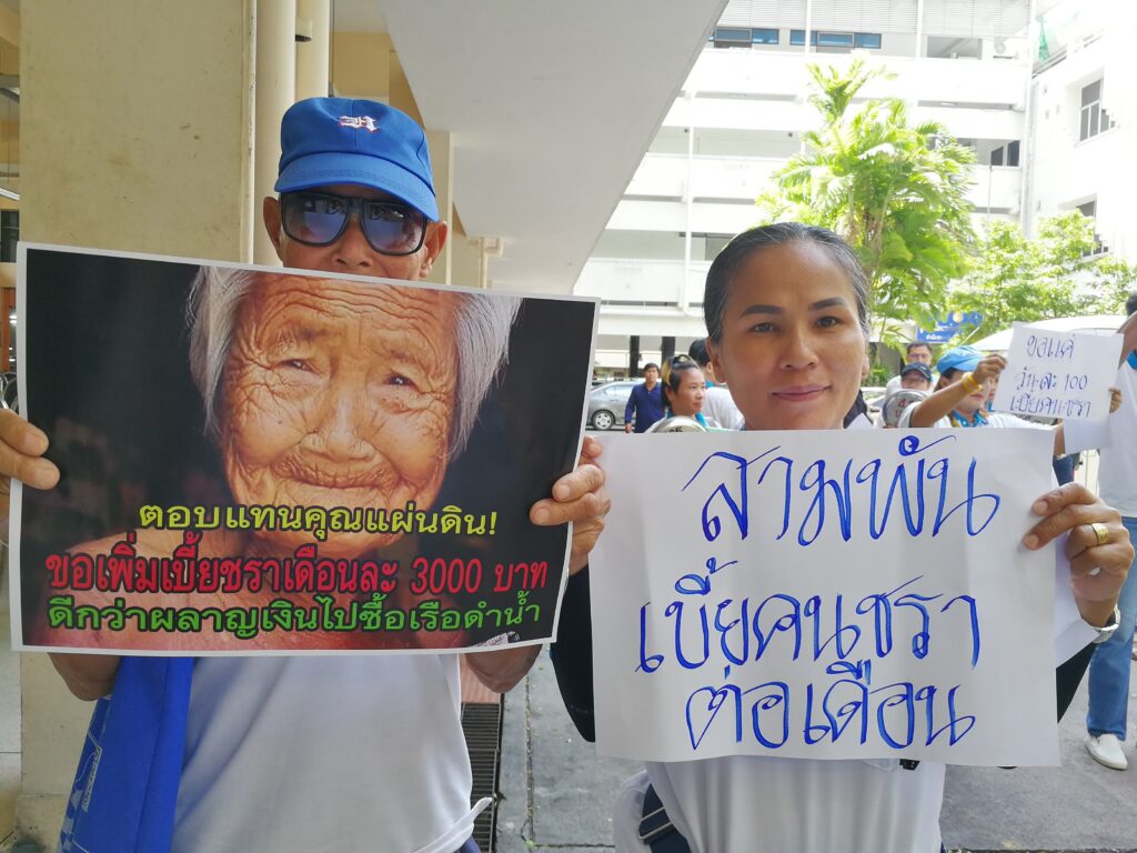 “La tasa de 600 THB (US$ 19) por mes que otorga el gobierno es demasiado baja y poco realista al momento de cubrir las necesidades básicas de los adultos mayores. Como resultado, los adultos mayores, cuyas vidas dependen de esta prestación mensual especial, tienen una calidad de vida pobre e indigna”, dijo Boonmee Wandee, un obrero fabril jubilado que acaba de cumplir 70 años.