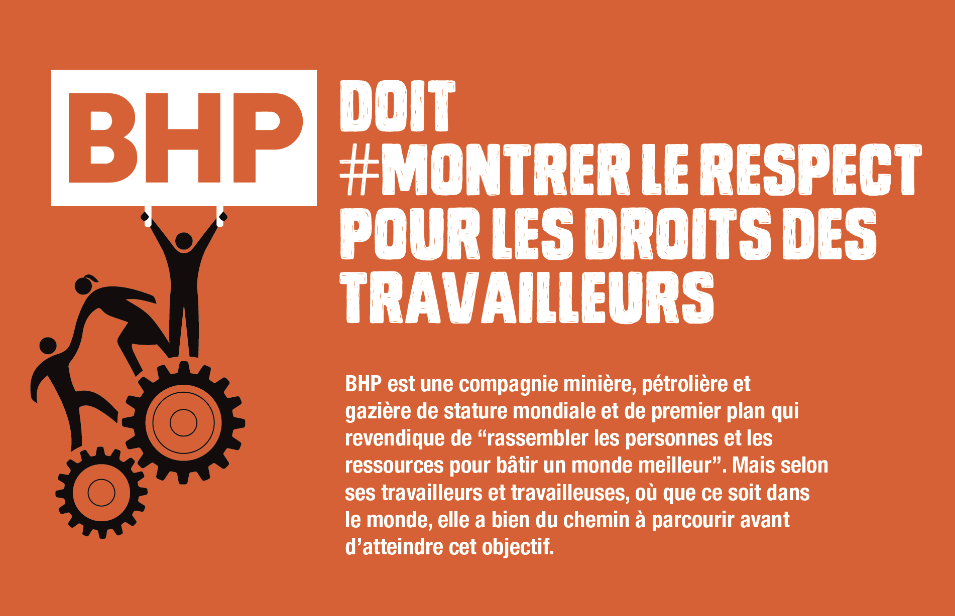 13 novembre, 2019BHP est une compagnie minière, pétrolière et gazière de stature mondiale et de premier plan qui revendique de “rassembler les personnes et les ressources pour bâtir un monde meilleur”. Mais selon ses travailleurs et travailleuses, où que ce soit dans le monde, elle a bien du chemin à parcourir avant d’atteindre cet objectif.