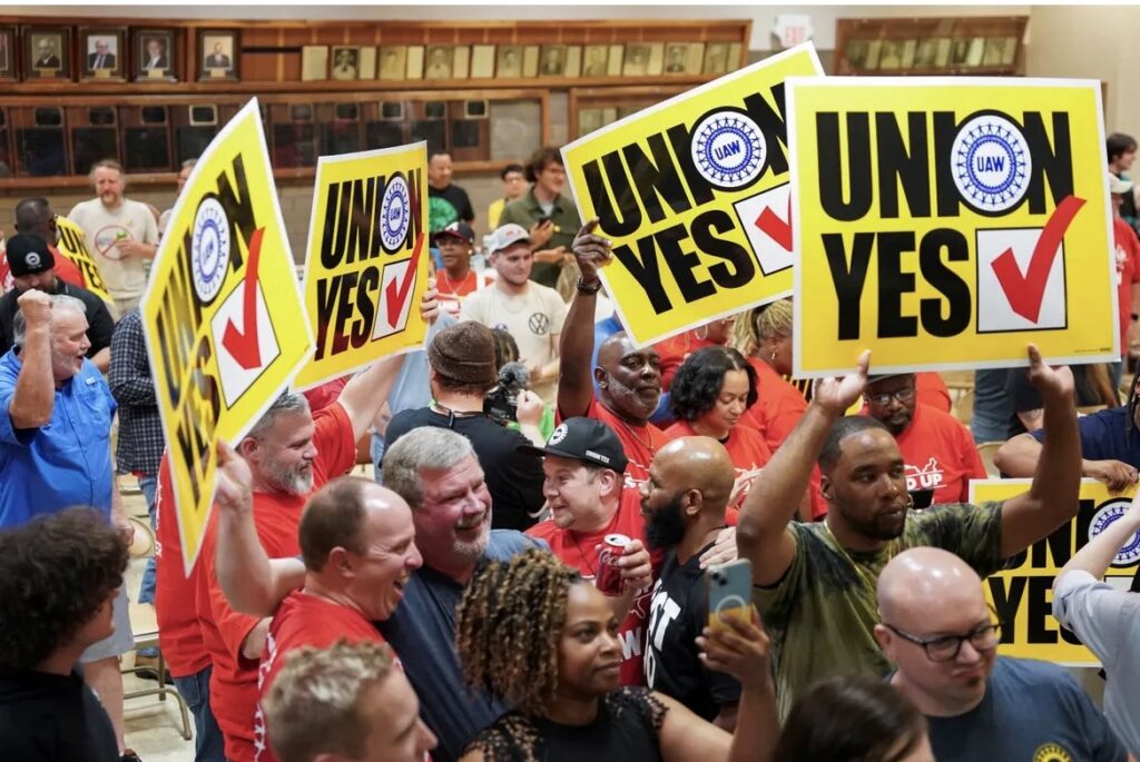 Ce projet de convention, qui va maintenant être soumis à un vote de ratification des salariés, prévoit une augmentation salariale de 20 %, une amélioration des prestations de santé, des dispositions plus strictes en matière de sécurité d’emploi et une amélioration des congés payés. Il s’agit de la première convention conclue à l’usine Volkswagen de Chattanooga, qui était, jusqu’au vote de 2024, la dernière implantation VW au monde à ne pas compter de représentation syndicale.
