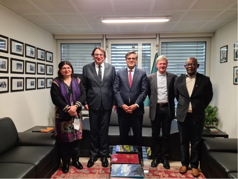 Le secrétaire général d'IndustriALL, Atle Høie, et son adjoint Kemal Özkan, ainsi que le directeur chargé de l'industrie minière, Glen Mpufane, ont rencontré l'ambassadeur et le représentant permanent du gouvernement pakistanais à la mission permanente du Pakistan à Genève pour insister sur la nécessité de ratifier la C176. La ministre du Travail, Mme Farhat Ayesha, était présente à la mission permanente aux côtés de l'ambassadeur, M. Khalil Hashmi.