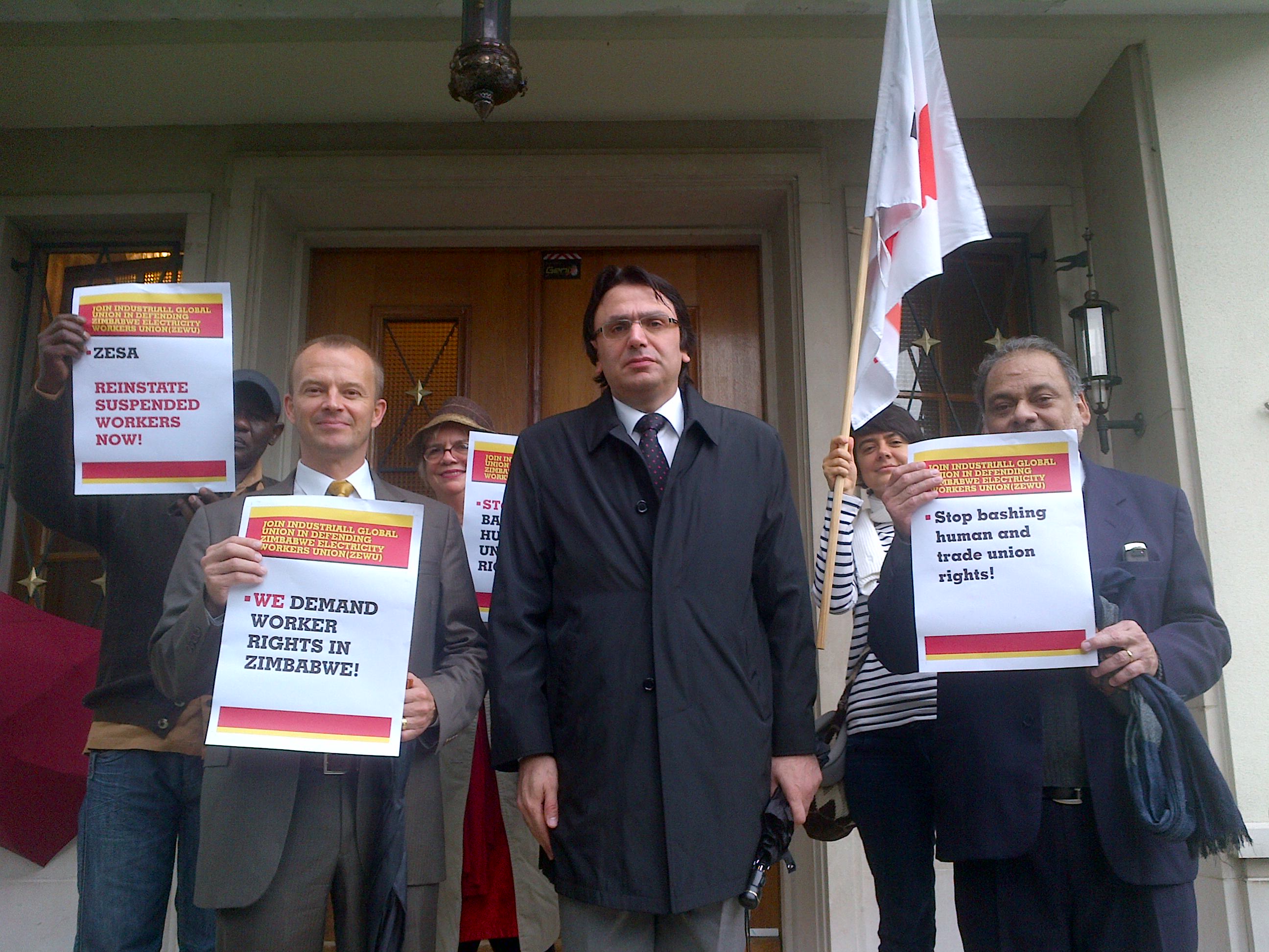 IndustriALL a réagi au traitement infligé au membre de son Comité exécutif en coordonnant des visites, le 10 octobre, aux ambassades du Zimbabwe à Johannesburg et à Genève. La direction de IndustriALL s’est rendue le 10 octobre à la mission du Zimbabwe aux Nations unies à Genève, où elle a demandé de rencontrer l’ambassadeur Manzou. L’ambassadeur avait ignoré plusieurs demandes de rencontre, et il a une fois de plus opposé son refus. Voir la vidéo du secrétaire général Raina insistant pour que l’ambassadeur entende les demandes de justice pour le ZEWU et Angeline Chitambo.