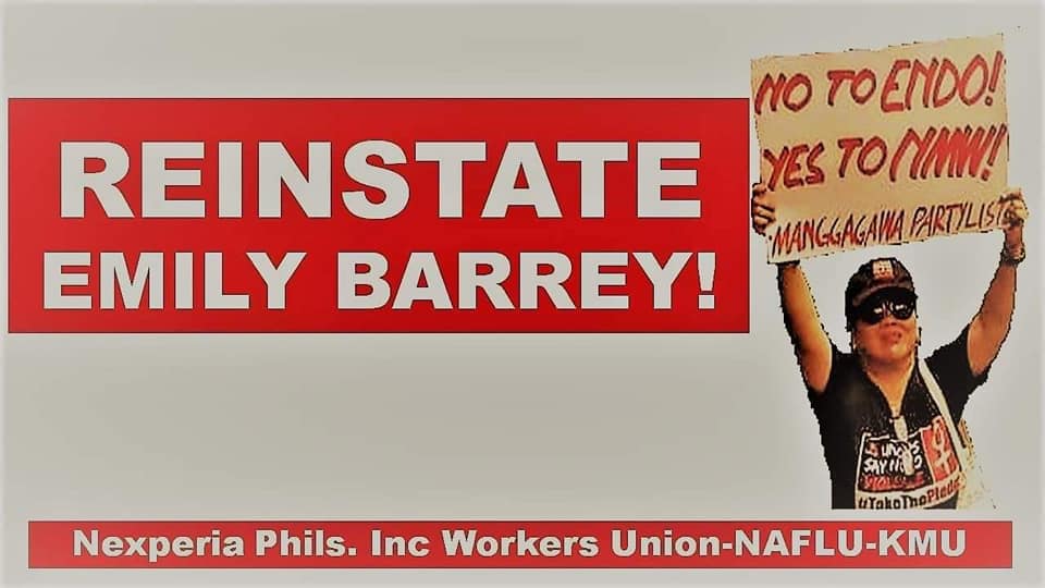 23 mars, 2021Le Syndicat des travailleurs de Nexperia Philippines a lancé une campagne pour la réintégration de sa vice-présidente, Emily Barrey, dont le syndicat affirme que le licenciement n’est qu’une manœuvre antisyndicale sous couvert de violation du protocole sanitaire Covid-19.