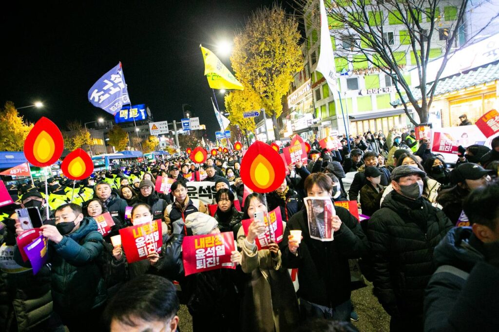 Les fondements démocratiques de la Corée du Sud ont été bâtis sur les sacrifices des travailleurs et des travailleuses et, une fois de plus, les travailleurs et travailleuses se mobilisent pour défendre ces principes. Des salariés de grandes entreprises telles que Hyundai Motor, GM Korea et Hyundai Mobis se sont joints à la grève, avec au moins 70.000 travailleurs et travailleuses participant au mouvement dans tout le pays au milieu de l’après-midi du 5 décembre.