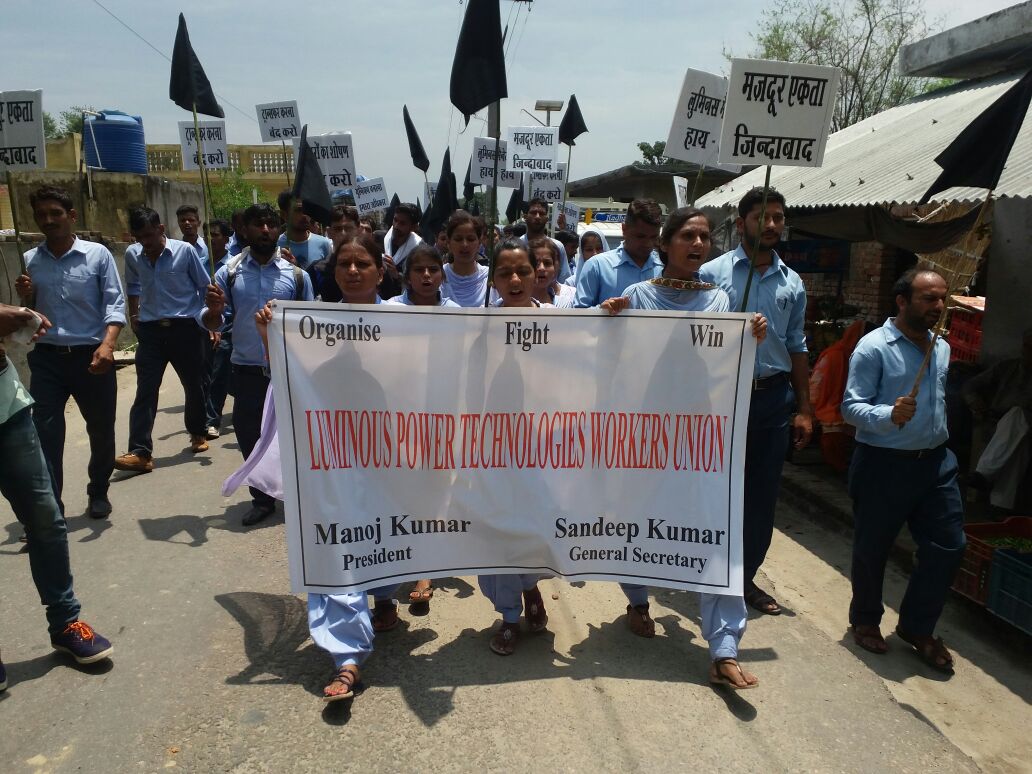 11 juin, 2018Les travailleurs et travailleuses de Luminous Power Technologies, propriété de Schneider Electric, spécialiste mondial en gestion de l’énergie, ont manifesté pour protester contre des actions vindicatives et des insultes de caste de la part de la direction ainsi que pour revendiquer le droit à la liberté syndicale.