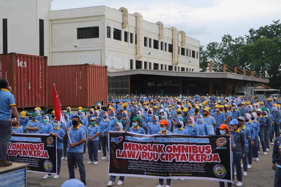 9 octobre, 2020Des milliers de travailleurs indonésiens de 30 provinces ont posé l'outil et sont descendus dans les rues pour exprimer leur colère après l'adoption de la loi multiple sur la création d'emplois, le 5 octobre.