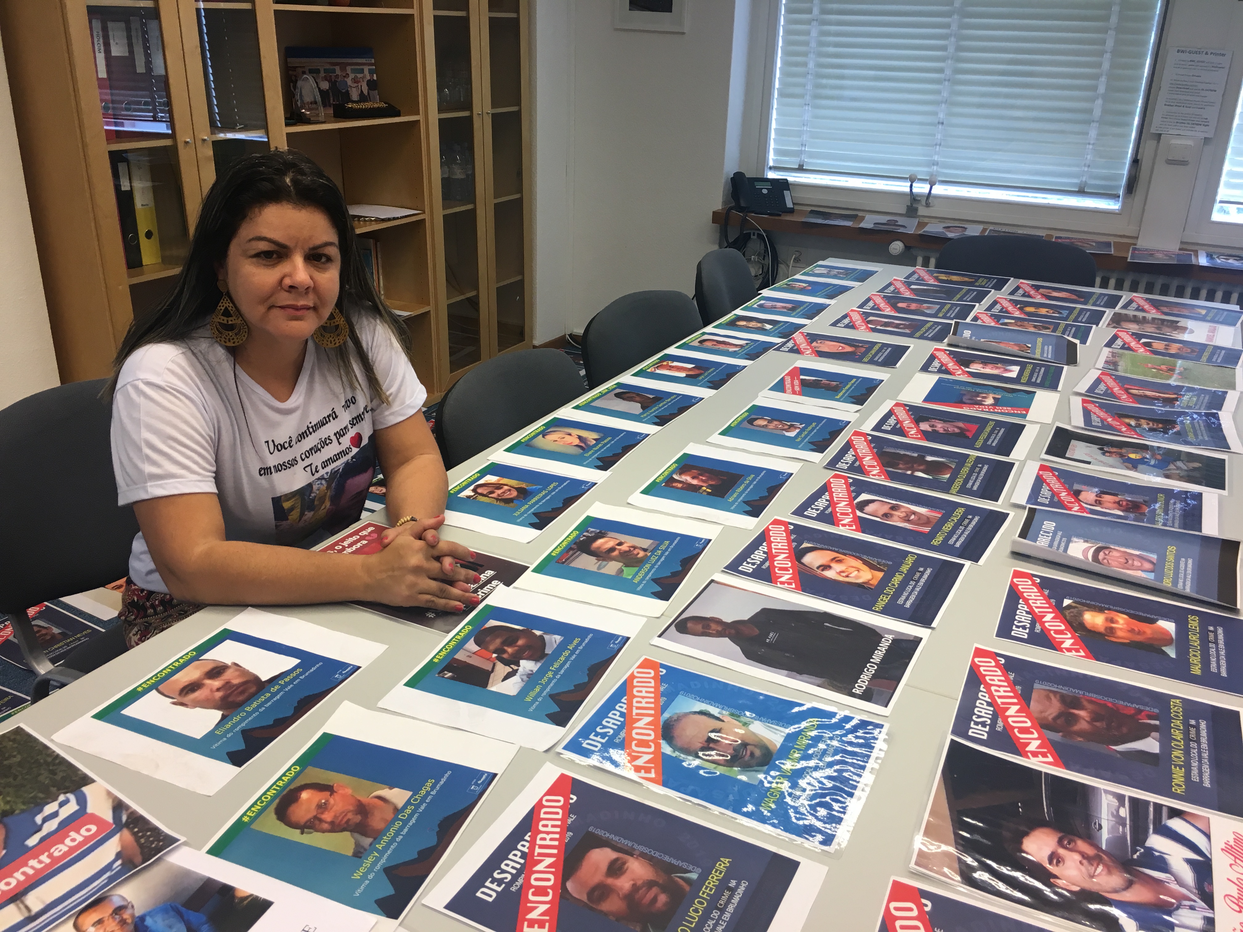 Andresa Rodrigues avec les photos des victimes de la rupture du barrage, à Genève en Suisse
