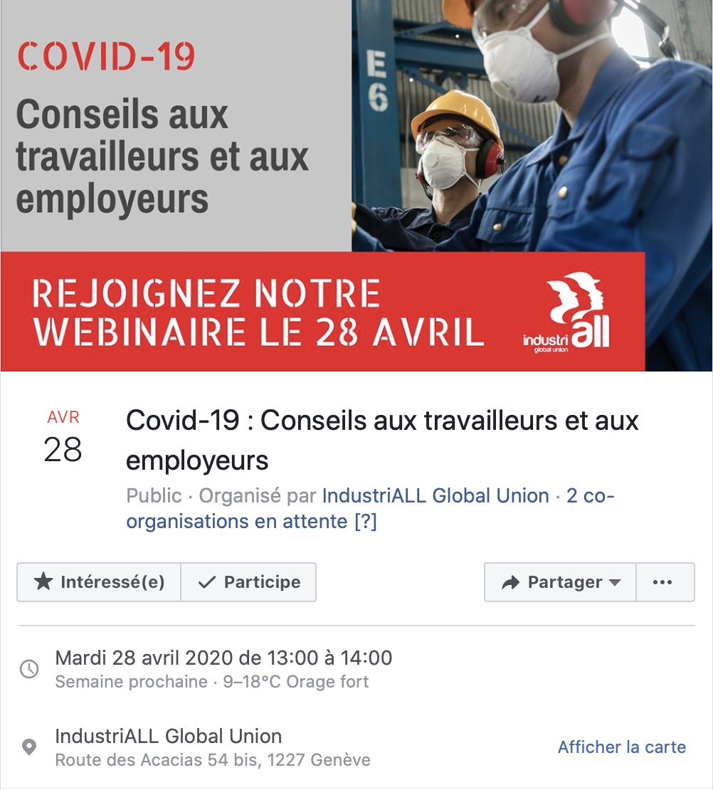 23 avril, 2020Webinaire d'IndustriALL sur Covid-19: Conseils aux travailleurs et aux employeurs