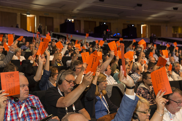 Ce congrès a eu lieu dans un contexte de crise économique et politique en Europe. On a vu dans le sillage de la crise de la dette souveraine l’effondrement du consensus politique, une augmentation de l’austérité et la domination d’une élite financière aux dépens de la société et du monde du travail. Des millions d’emplois industriels ont été perdus, le niveau des salaires est sous l’étouffoir et on connaît une croissance extraordinaire de l’emploi précaire. Aussi, les droits syndicaux sont sous le feu d’attaques partout sur le continent.