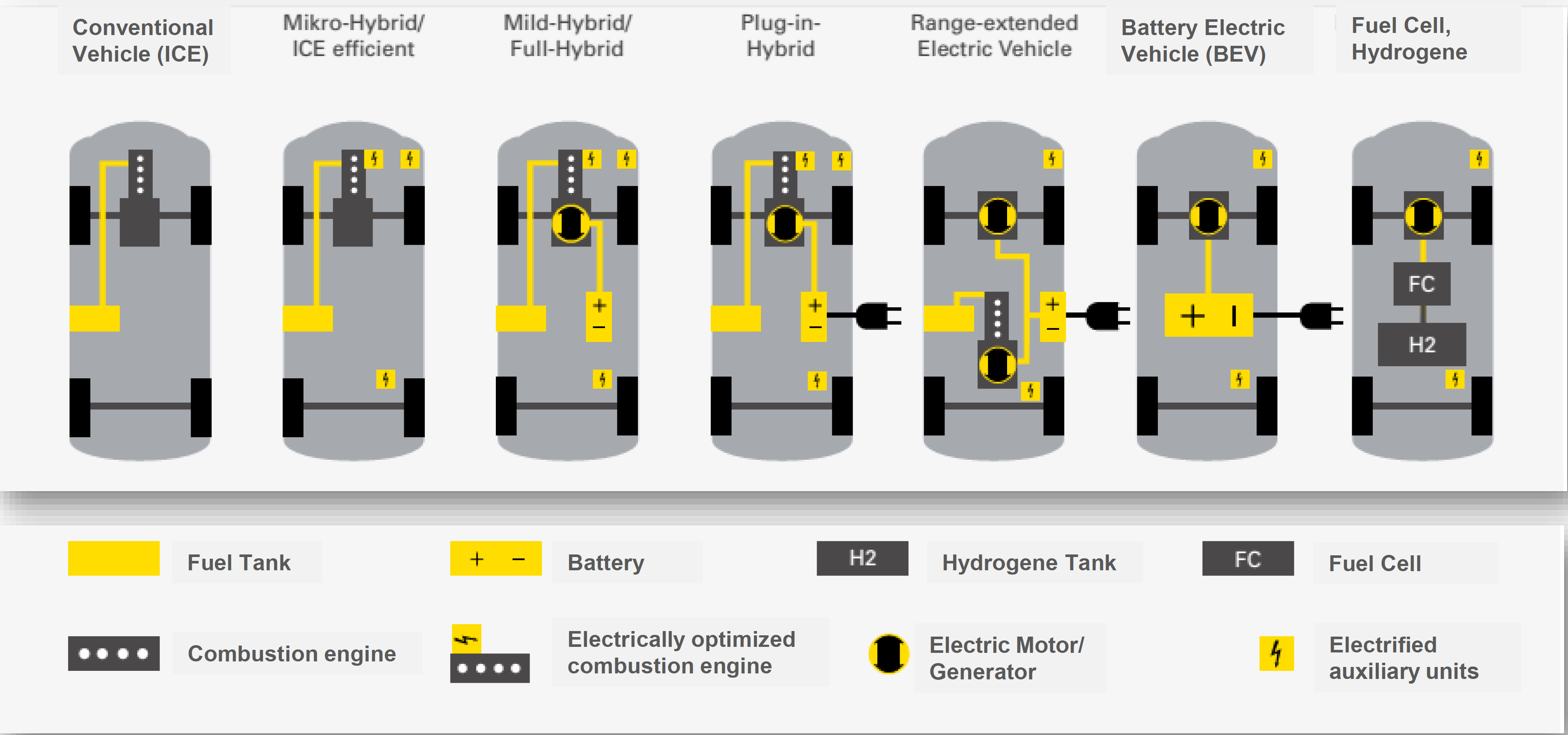 Un certain nombre de technologies différentes appliquées aux véhicules sont élaborées, notamment des systèmes hybrides (HEV et PHEV), des batteries (BEV) et des piles à hydrogène (FCEV). On ne peut pas dire laquelle va dominer. La demande future en main d’œuvre va largement dépendre du type de groupe propulseur qui viendra sur le marché et à quel moment. Il est probable que les trois types de technologies vont cohabiter.