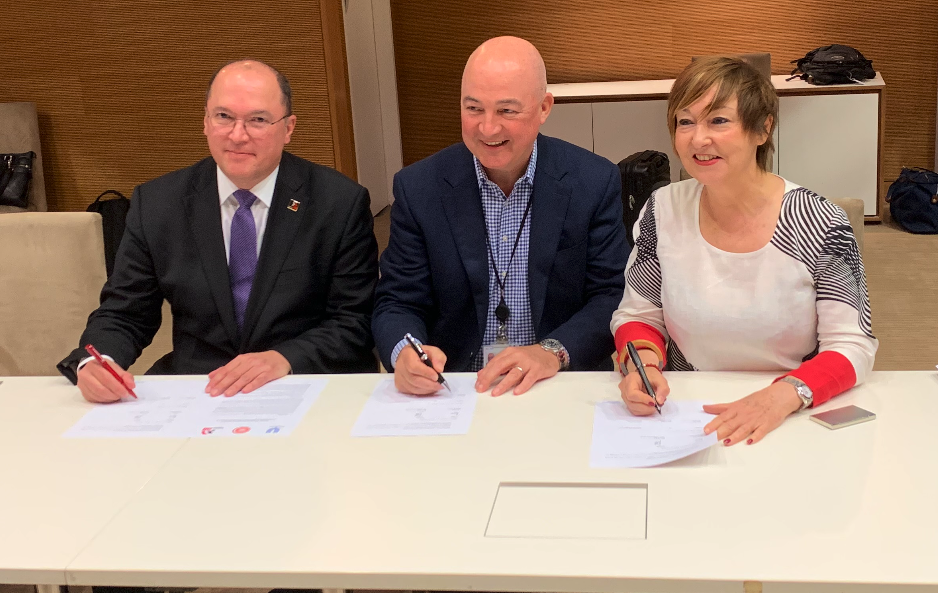 Le Secrétaire général d’IndustriALL, Valter Sanches, le PDG d’Unilever, Alan Jope, et la Secrétaire générale d’UITA, Sue Longley.