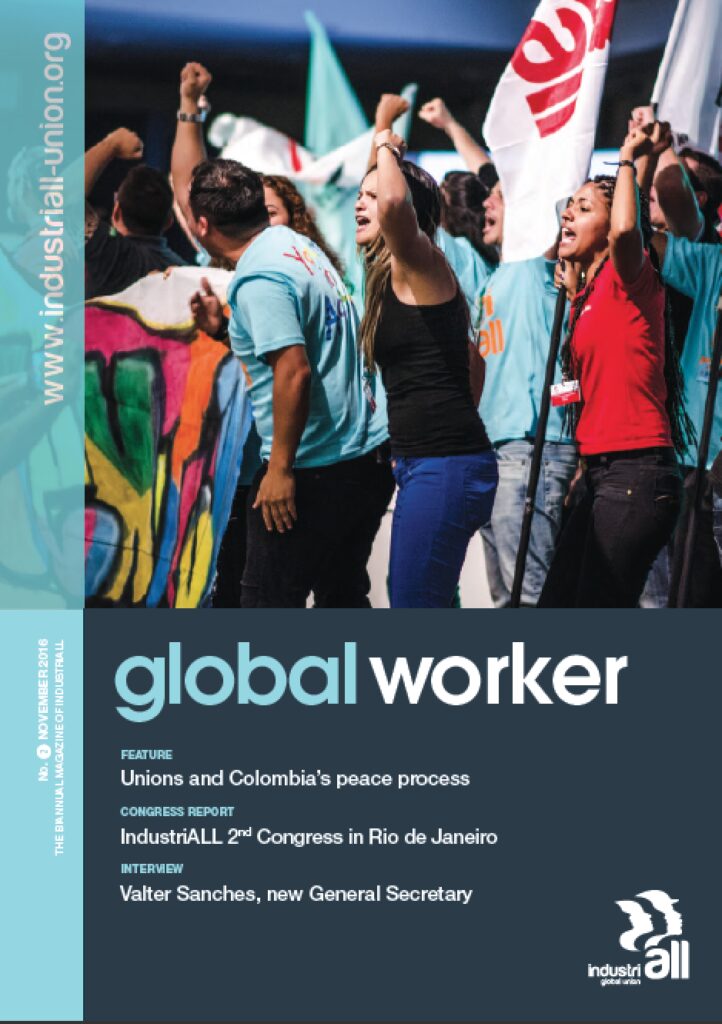 Continuing the Latin American theme, there is a feature on trade unions’ role in the peace process in Colombia. A resolution supporting peace in the fractured country was unanimously adopted by IndustriALL affiliates at Congress.
