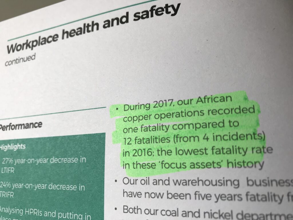 Glencore chief executive officer Ivan Glasenberg remarked on Glencore’s 2018 first quarter earnings call about the company’s health and safety performance in 2017, stating “the one area we did have a lot of success is African Copper where we only had one fatality in 2017, which is the lowest in history in one of these asset regions and this is where we have spent a lot of work. It seems that we’re achieving success there…”
