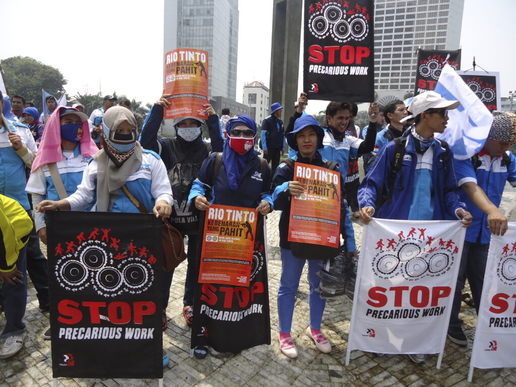 The IndustriALL affiliates in Indonesia held an action in front of Bundaran HI, Jakarta to mark the World day for Decent Work and the Rio Tinto Global day of Action . Around 500 workers, including their key leaders, joined the activity. The workers came from 10 federations, which included: FSP KEP, CEMWU, SpN, FSP2KI, LOMENIK, FSPMI, FSP2KI, GARTEKS, ISI, FPE, and KIKES. IndustriALL affiliate the Chemical, Energy and Mines Workers Union (CEMWU) took this opportunity to raise the issues that workers face at Rio Tinto/ Freeport and Geo Services.