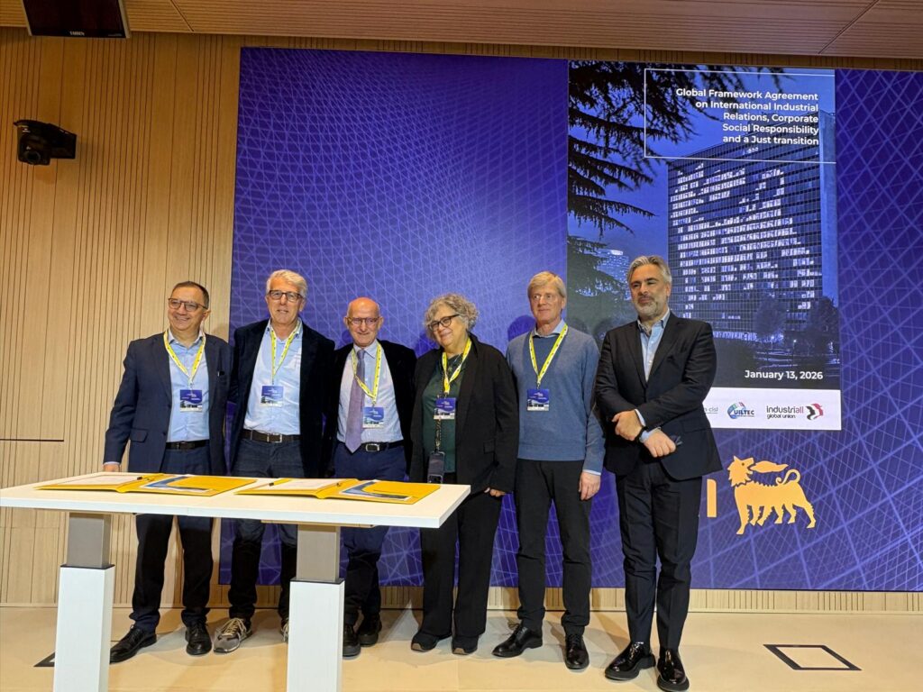 At the signing ceremony held in Milan on 13 January, representatives of ENI’s global management, Italian trade unions, and an international delegation from IndustriALL underscored the significance of the agreement as a living instrument for social dialogue and the protection of labour rights throughout the company’s global value chain.